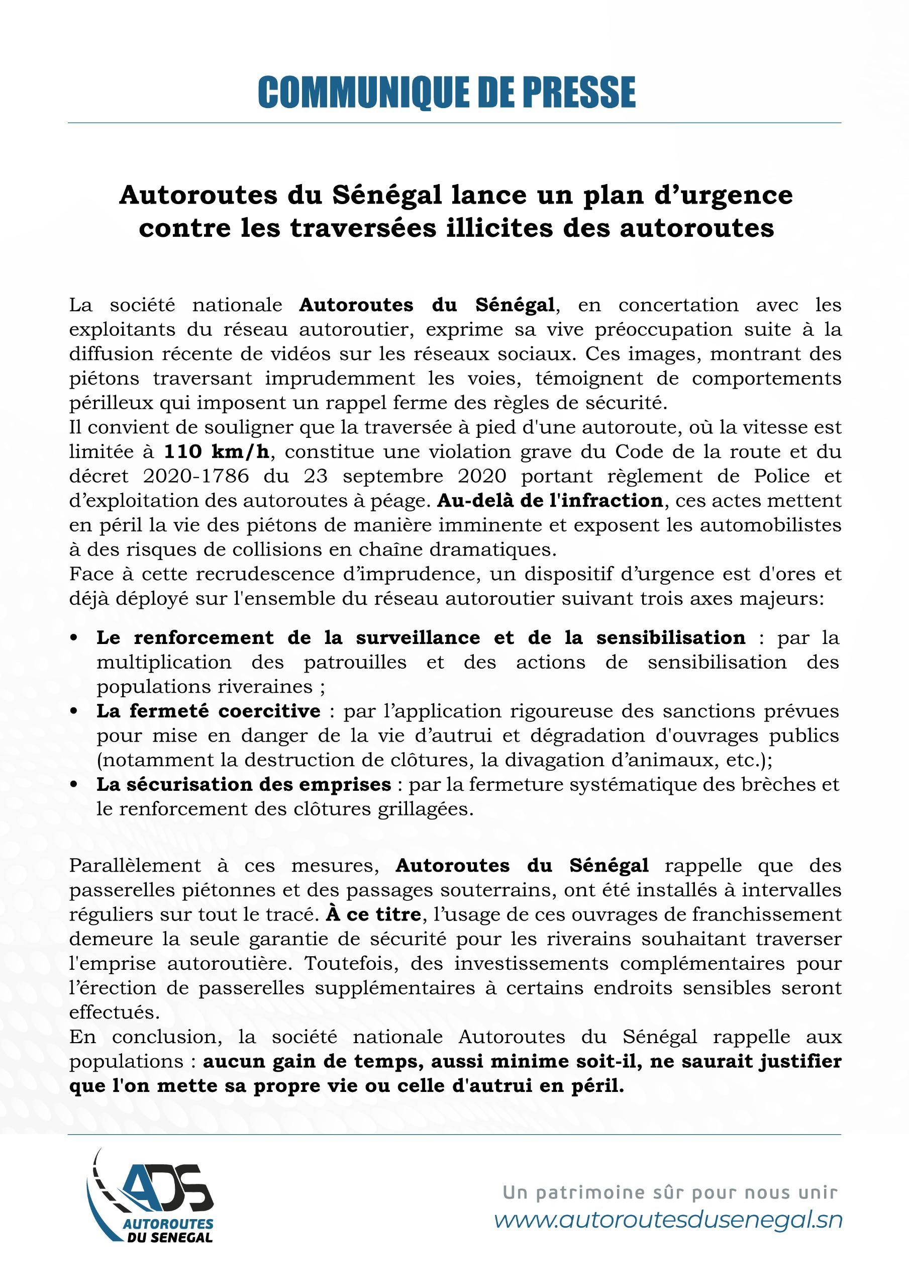 Autoroutes du Sénégal lance un plan d’urgence contre les traversées illicites des autoroutes